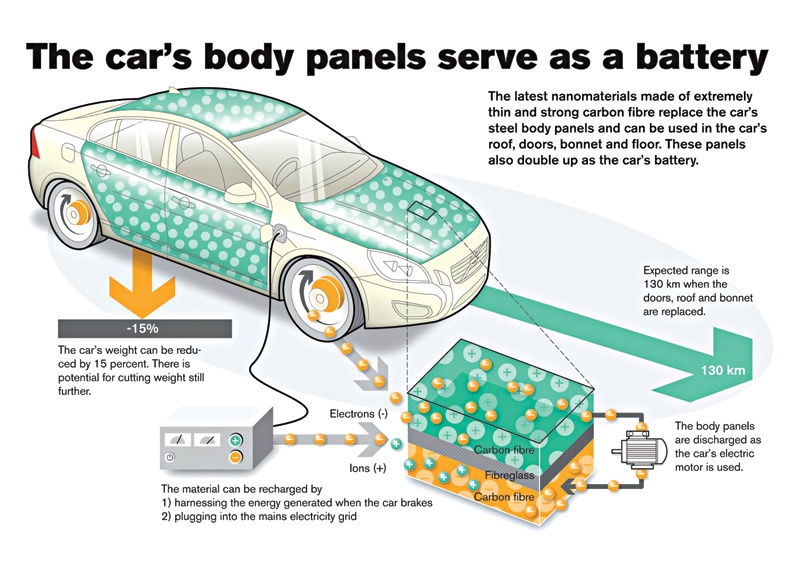 Ở châu Âu, một nhóm 9 nhà sản xuất xe hơi đang hợp tác nghiên cứu và thử nghiệm các tấm ốp thân có khả năng tích trữ năng lượng và sạc nhanh hơn cả các bộ pin ngày nay. Các tấm ốp này được làm bằng sợi polimer và nhựa carbon. Chúng đủ cứng để ốp lên xe và cũng đủ mềm dẻo để đúc thành tấm. Bằng việc sự dụng các tấm ốp này, trọng lượng của xe có thể giảm 15%.