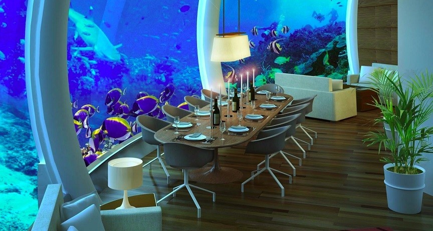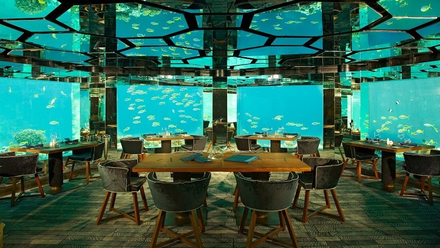 3. Nhà hàng Sea.Fire.Salt.Sky Cũng nằm ở thiên đường du lịch Maldives, nhà hàng mang đến những phong cách khác lạ đúng như tên gọi của nó. Sea.Fire.Salt.Sky. gồm 4 tầng, với tầng Trời (Sky) ở trên cùng và tầng Biển (sea) nằm dưới đáy. Du khách thỏa sức ngắm nhìn những sinh vật biển bơi lội xung quanh, thông qua lớp kính trong suốt và góc nhìn rộng rãi. Nhà hàng có cả hầm rượu vang dưới nước với bộ sưu tập các loại rượu quý hiếm. |