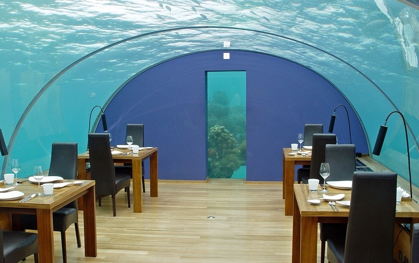 6. Nhà hàng Ithaa Undersea Nhà hàng được thiết kế bởi M. J, Murphy, Ithaa Undersea, được hoàn thiện vào năm 2005 ở Maldives. Điểm nhấn của nhà hàng là khu đường hầm bằng kính trong suốt, cung cấp góc nhìn lên tới 270 độ, giúp du khách thỏa sức ngắm nhìn khung cảnh dưới nước xung quanh. Ngoài ra, nơi đây cũng phục vụ những bữa ăn tuyệt ngon và cả dịch vụ tổ chức đám cưới lãng mạn. |