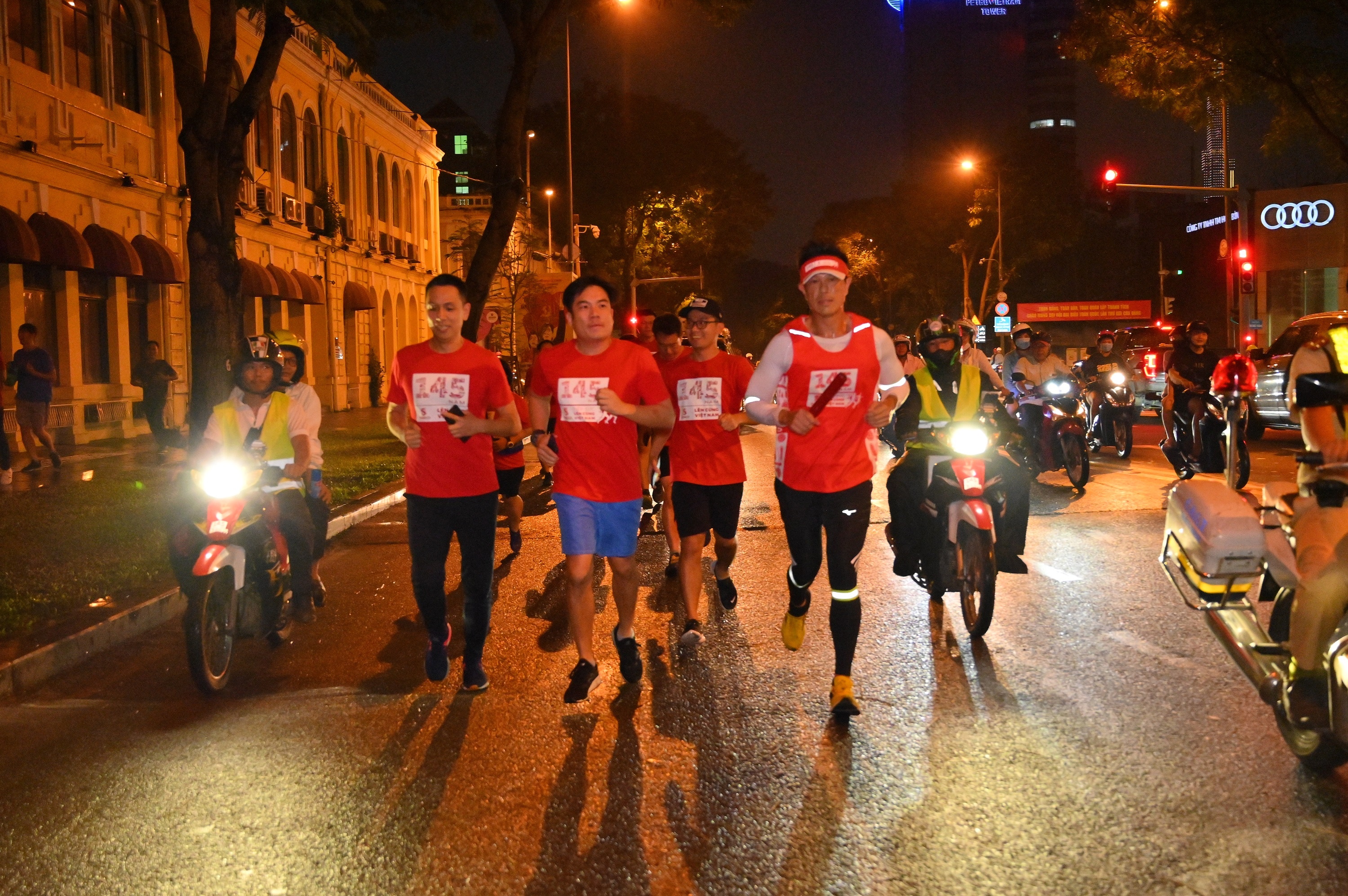 | Ngày 19/10 Trong ngày thứ 3, tại thành phố Vinh, thời tiết bắt đầu chuyển biến xấu do ảnh hưởng của áp thấp nhiệt đới. Mặc mưa lớn, người chạy vẫn quyết tâm tiến về phía trước trong tiếng động viên của người dân cùng sự hỗ trợ tận tình từ ban tổ chức. |