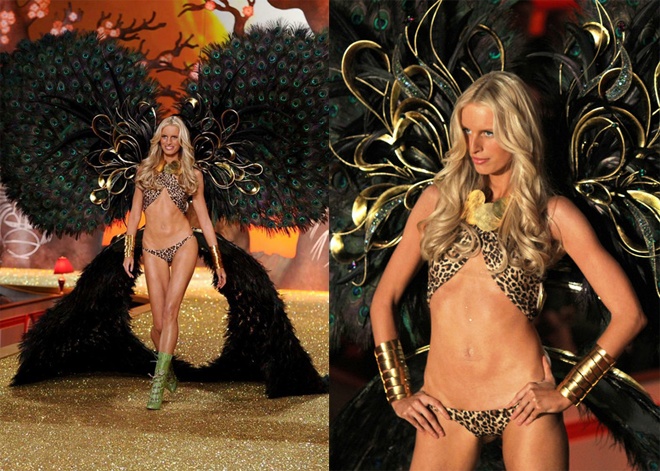 | Đây cũng là show diễn gây ấn tượng mạnh mẽ với khán giả, khi người mẫu Karolina Kurkova xuất hiện lộng lẫy trên sân khấu với đôi cánh thiên thần được kết bằng hàng ngàn chiếc lông chim công rực rỡ. |