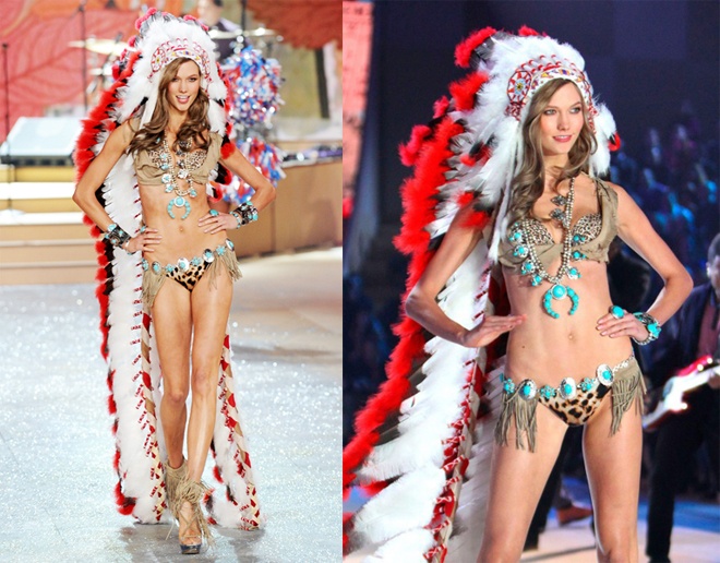 | Victoria’s Secrect và người mẫu Karlie Kloss đã vấp phải rắc rối trong show diễn năm 2012, khi chân dài này mặc một mẫu thiết kế nội y gây liên tưởng đến trang phục truyền thống của người Mỹ bản địa. Kết quả đại diện Victoria’s Secrect và cả Kloss phải xin lỗi khán giả, giới truyền thông, cũng như cam kết sẽ không lặp lại sai lầm tương tự trong các chương trình sau. |