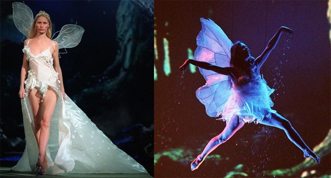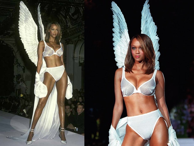 | Những đôi cánh thiên thần đặc trưng cho Victoria’s Secrect Show bắt đầu xuất hiện từ năm 1996, và đến năm 1998, Tyra Banks đã ghi dấu ấn đặc biệt khi xuất hiện trong bộ nội y trắng kèm đôi cánh thiên thần nóng bỏng có giá hàng triệu đô. |