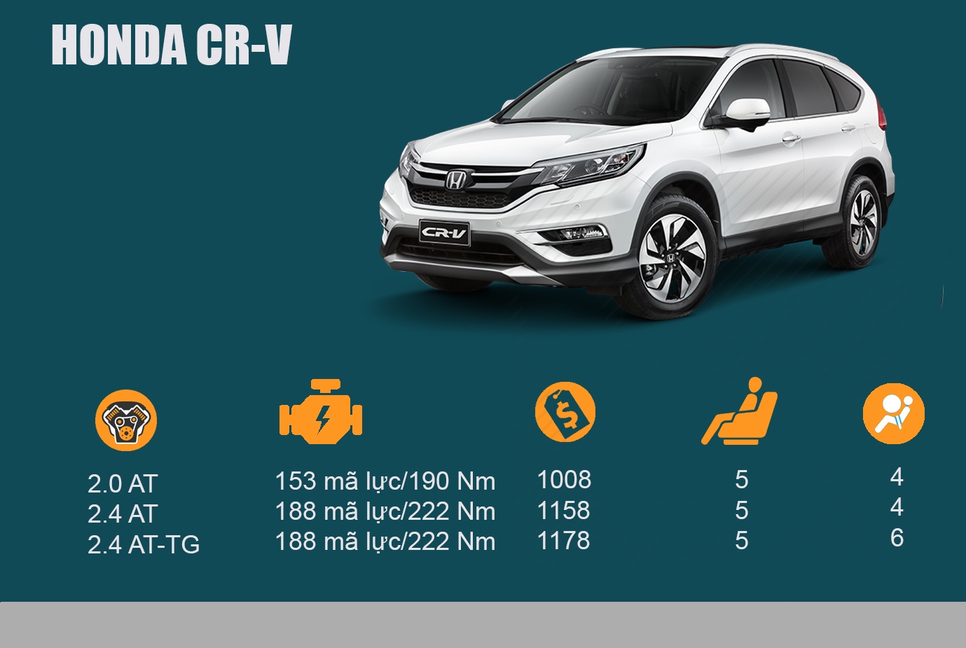 Đã từ lâu, Honda CR-V là cái tên nổi trội trong phân khúc crossover tầm giá 1 tỷ đồng tại Việt Nam. Hiện nay, CR-V được lắp ráp trong nước với 3 phiên bản, mức giá lần lượt 1,008 tỷ cho bản 2.0, 1,158 tỷ cho bản 2.4 và 1,178 tỷ đối với phiên bản cao cấp nhất, 2.4 TG.