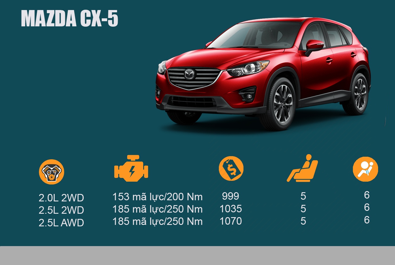 Mazda CX-5 là mẫu crossover 5 chỗ sáng giá tại thị trường Việt Nam. Xe được lắp ráp trong nước nên giá thành khá dễ chịu, bản thấp nhất có giá 999 triệu đồng, phiên bản 2.5 dẫn động cầu trước giá 1.035 triệu và bản cao cấp nhất dẫn động 4 bánh giá 1.070 triệu đồng.
