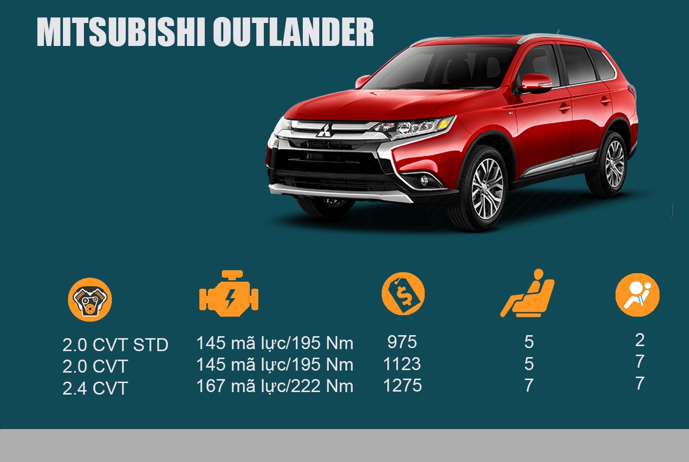 Misubishi Outlander phiên bản 2016 là cái tên mới nhất gia nhập phân khúc crossover tầm giá 1 tỷ đồng tại Việt Nam. Outlander được phân phối 3 phiên bản, bao gồm Outlander 2.0 CVT STD có giá 975 triệu đồng. Phiên bản 2.0 CVT giá 1,123 tỷ đồng và bản cao nhất 2.4 CVT giá 1,275 tỷ đồng (7 chỗ ngồi).