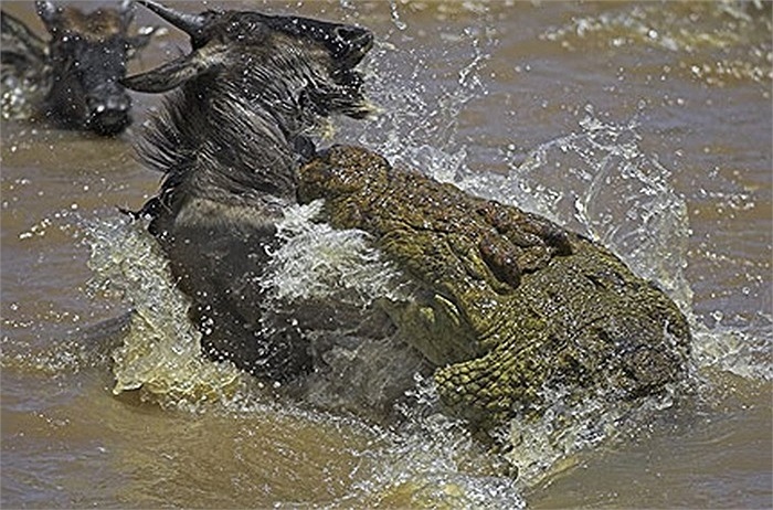 | Một con linh dương đầu bò cũng bất lực trước hàm cá sấu. |