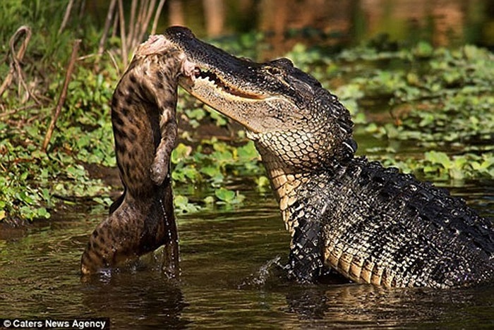 | Con cá sấu từ dưới nước lao lên cắn xé rồi xơi tái con mèo trong nháy mắt. |