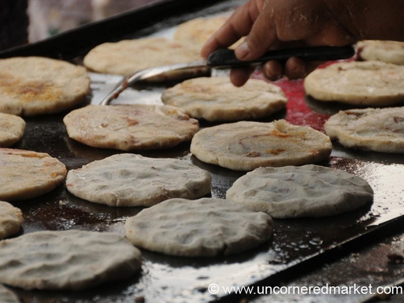 El Salvador: Pupusa gồm lớp vỏ bánh từ ngô, với nhân đậu đỏ, phô mai và chicharron (thịt ba chỉ rán), thêm dưa góp và ớt lên trên. Món này vừa rẻ, vừa no bụng và dễ tìm. Ảnh: Uncornered Market. |
