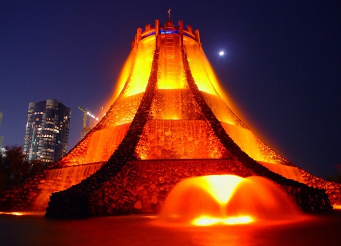 Đài phun nước hình núi lửa ở Abu Dhabi: Có cảm giác như những dòng dung nham đang rừng rực cháy ở đây. |
