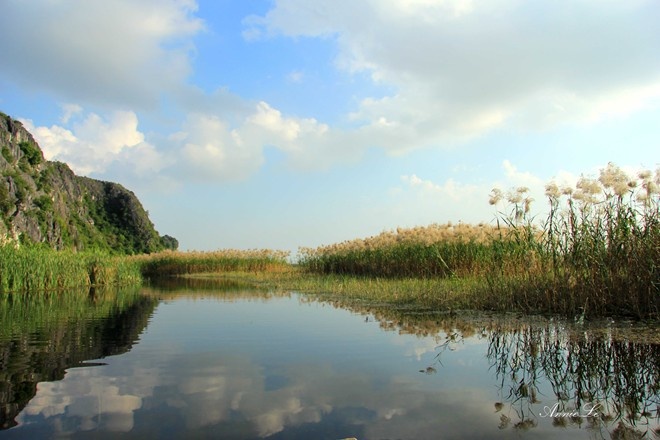 Lướt trên thuyền tham quan đầm Vân Long, bạn sẽ cảm nhận được về một vịnh nước trong vắt như gương, phẳng lặng không một gợn sóng. Hai bên đầm là những bãi lau sậy, nơi trú ẩn của nhiều loài chim. Ảnh: Cỏ Biếc. |