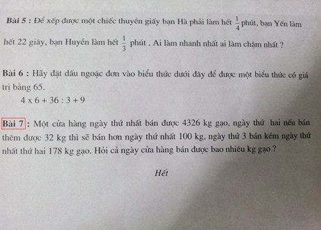 Cụ thể có hai vế khiến người xem không ngừng đặt câu hỏi: “Ngày thứ ba bán kém ngày thứ nhất thứ hai 178 kg gạo” và “Hỏi cả ngày cửa hàng bán được bao nhiêu kg gạo” là hỏi riêng ngày thứ 3 hay là cả ba ngày?