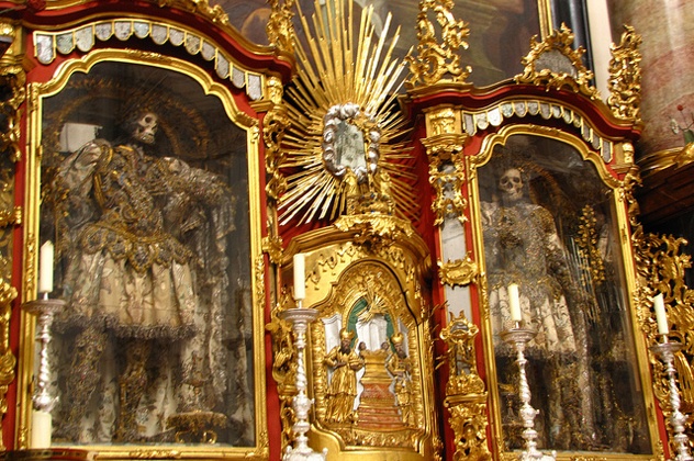 Waldsassen Basilica là nhà thờ độc đáo tại Đức, nơi lưu giữ và thờ 10 bộ xương người. Những bộ hài cốt trong nhà thờ đều được bảo quản tốt và đeo nhiều trang sức quý. Người ta cho rằng, 10 bộ xương trên là của những người tử vì đạo Kito giáo. Ảnh: Listverse.