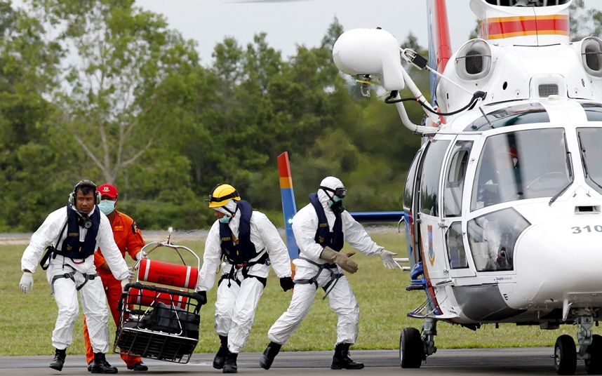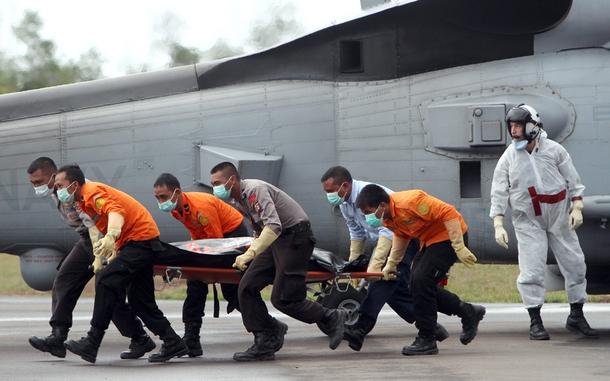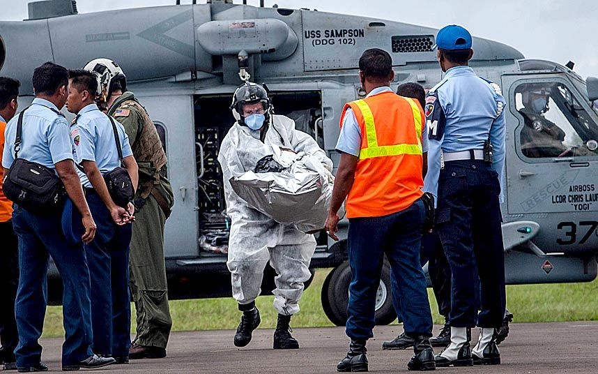 Thủy thủ Mỹ trên tàu USS Sampson di chuyển vật thể từ khu vực tìm kiếm QZ8501 vào đất liền bằng máy bay trực thăng. Ảnh: AFP |