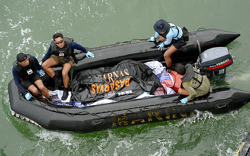 Thi thể hành khách cùng các di vật được vớt lên một chiếc xuồng cao tốc của Hải quân Indonesia. Ảnh: AFP |