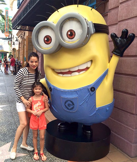 | Universial Studios: Hồi cuối tháng 7/2014, nữ diễn viên Hương Ga tạm ngưng mọi hoạt động đưa con gái sang quốc đảo sư tử du lịch. Singapore là địa điểm yêu thích của Bảo Tiên bởi ở đây có nhiều khu trung tâm thương mại lớn với những cửa hàng đồ chơi mà cô bé mê mẩn. Universial Studios là điểm đến không thể bỏ qua của nhiều người. |