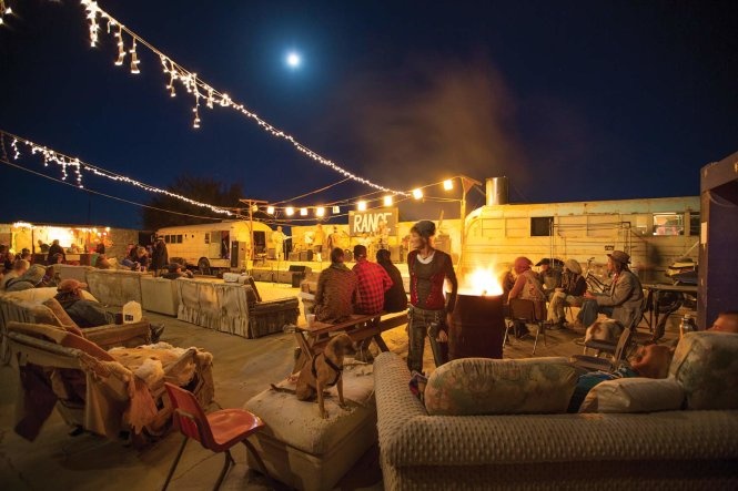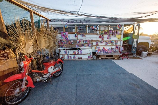 Vào hè, Slab City chỉ có 150 cư dân bám trụ trên những căn nhà di động trang bị các tấm năng lượng mặt trời tự chế trong sức nóng thiêu đốt. Nhưng vào mùa đông Slab City trở nên tấp nập khi dân số lên 500 người. Dấu hiệu của Slab City - Ảnh: flickr