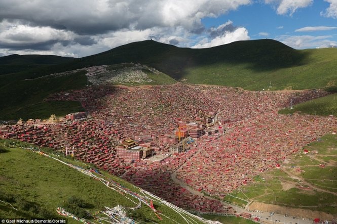 4. Larung Gar: Ẩn mình giữa cao nguyên Tây Tạng là thành phố Phật giáo Larung Gar thuộc tỉnh Tứ Xuyên, Trung Quốc với khoảng 10.000 (theo một số tài liệu là 40.000) tăng, ni và sinh viên Phật giáo sinh sống với những ngôi nhà bằng gỗ sơn đỏ như xếp chồng lên nhau trên một sườn đồi ở độ cao 4.000m.