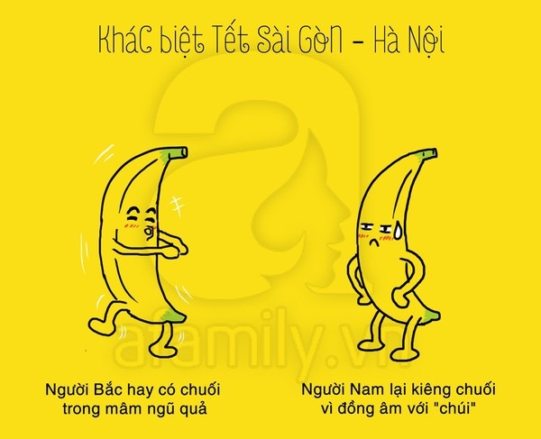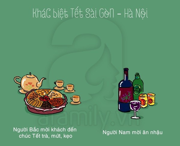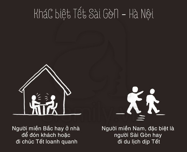 Tết ở Sài Gòn dường như đơn giản hơn ở Hà Nội. Người Sài Gòn thích đi du lịch còn ở Hà Nội lại thích sum họp gia đình. Ở Hà Nội kiêng ăn trứng, còn ở Sài Gòn thì kiêng ăn chuối.