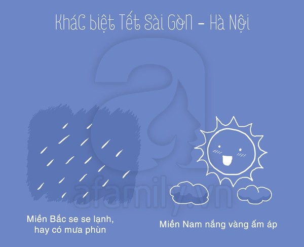 | Điểm khác đầu tiên phải kể đến thời tiết. Ngày Tết, miền Bắc se se lạnh, hay có mưa phùn, miền Nam thì ấm áp nắng vàng. Thời tiết cũng dẫn đến một điểm khác biệt trong ngày Tết ở hai miền, đó là cách ăn mặc của người dân. |