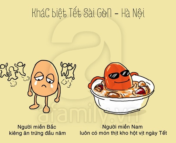 Người miền Bắc kiêng ăn trứng đầu năm vì cho rằng trứng có hình thù giống với số không. Còn người miền Nam luôn có món thịt kho hột vịt ngày Tết.