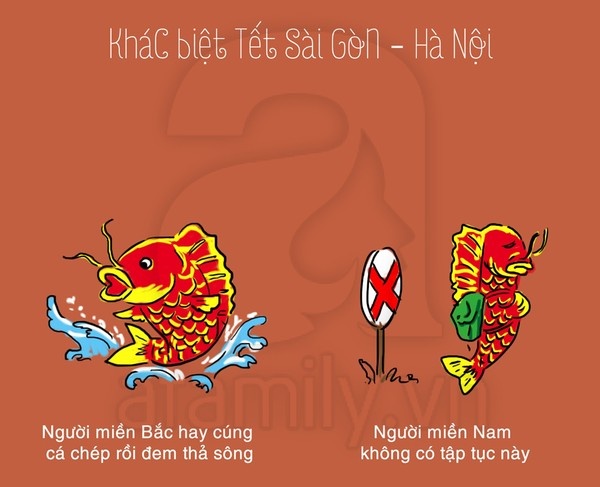 | Ngày cúng ông Công, ông Táo, người miền Bắc hay cúng cá chép rồi đem thả sông. Người miền Nam không có tập tục này. |