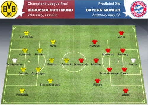| Đội hình dự kiến ra sân trong trận chung kết của Bayern và Dortmund. |