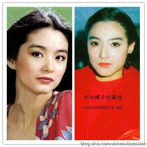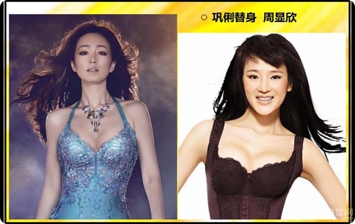 | Củng Lợi (trái) và Châu Hiển Hân giống nhau như hai giọt nước. Châu Hiển Hân đóng thế cảnh nóng cho Củng Lợi trong phim Châu Ngư hỏa xa. |