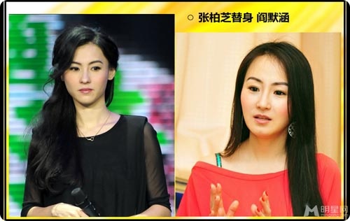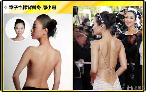 | Chương Tử Di (phải) và bản sao trong một sự kiện. Nhìn từ đằng sau và nhìn nghiêng, người đóng thế này rất giống Chương Tử Di. Nữ diễn viên đóng thế Thiệu Tiểu San (Shao Xiaoshan) từng đóng thế cảnh nóng thay cho cô trong phim Dạ yến. |