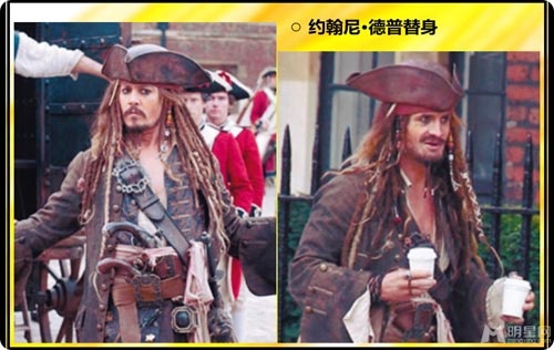 | Johny Depp (trái) và bản sao đóng thế trong phim Cướp biển vùng Caribbe giống nhau như hai giọt nước khiến nhiều người trong đoàn làm phim không thể phân biệt được. |