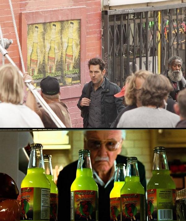 Trong The Incredible Hulk (2008), Bruce Banner (Edward Norton) từng làm rơi máu của bản thân vào một trong những chai soda màu xanh tại nơi anh làm việc, khiến nó bị nhiễm chất phóng xạ gamma. Nay loại soda đó lại “tái xuất giang hồ” trên một tấm biển quảng cáo đường phố, ngay sau cảnh Scott Lang bị sa thải khỏi Baskin Robbins.