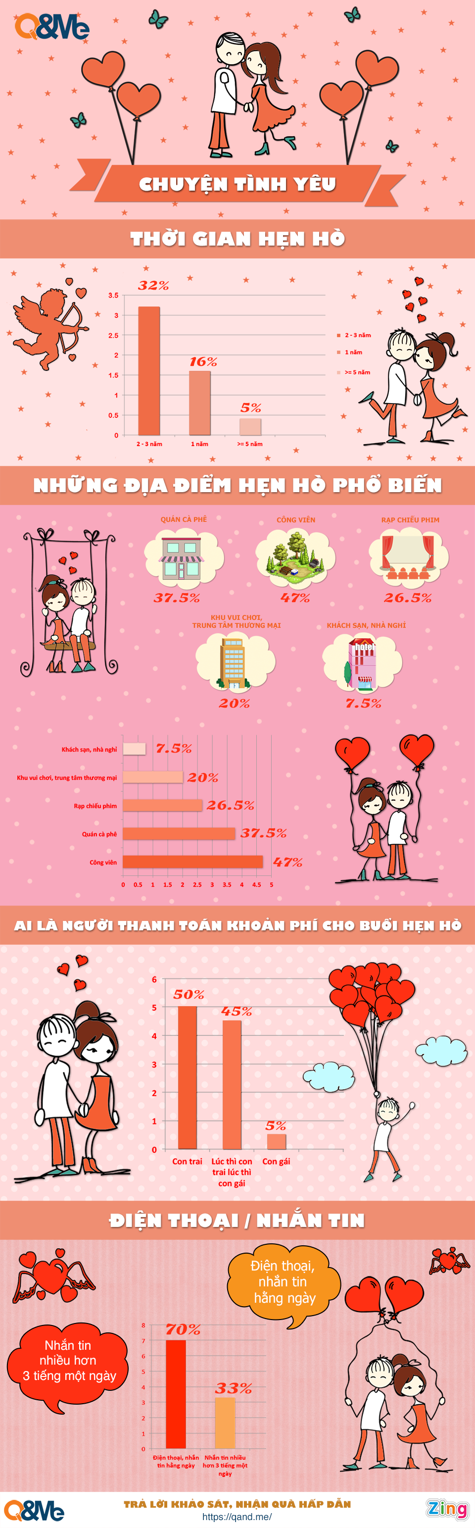 Ít ai biết rằng các bạn trẻ Việt hẹn hò nhiều nhất tại công viên, và chỉ số ít cặp đôi yêu quá 5 năm. Bảng khảo sát được thực hiện bởi Q&Me, thuộc công ty Asia Plus.