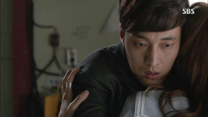 | Joo Joong Won của So Ji Sub trong Master's Sun đỡ dao thay người yêu và ngã gục ngay trên vai cô. |