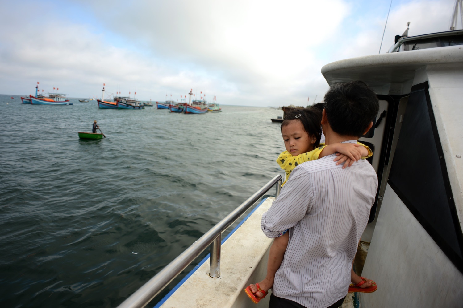 | Cô bé say mê ngắm mặt biển khi đứng cùng cha trên thành tàu cao tốc Lý Sơn - Sa Kỳ. Những chuyến tàu cao tốc nối Lý Sơn với đất liền khiến đảo tiền tiêu trở nên gần gũi hơn với mọi người. |