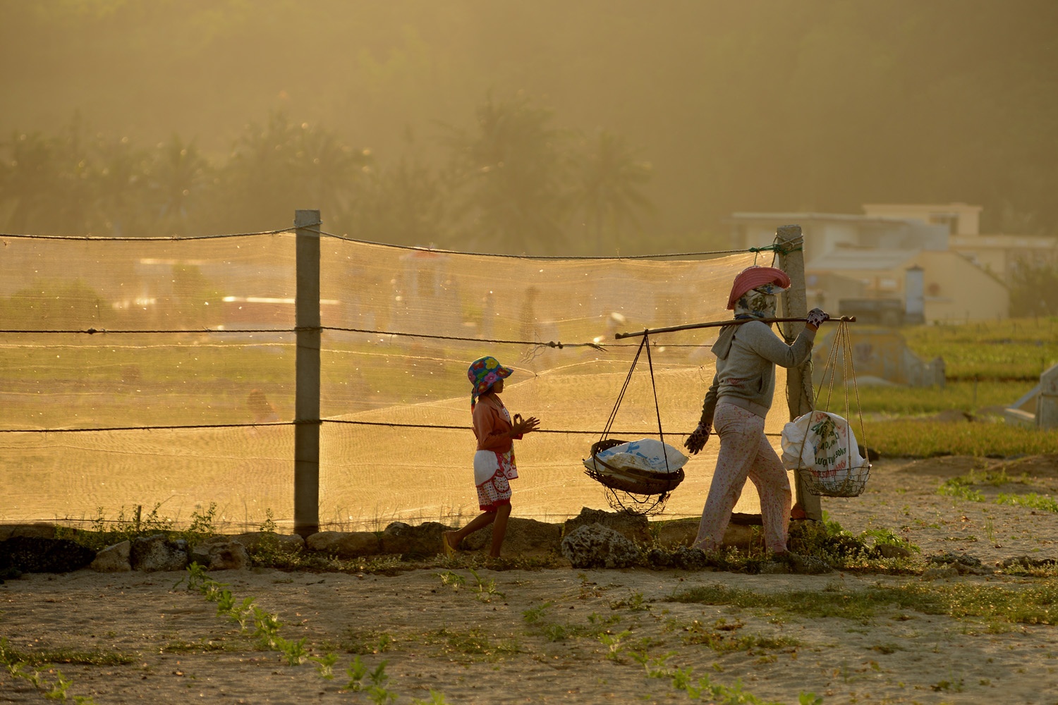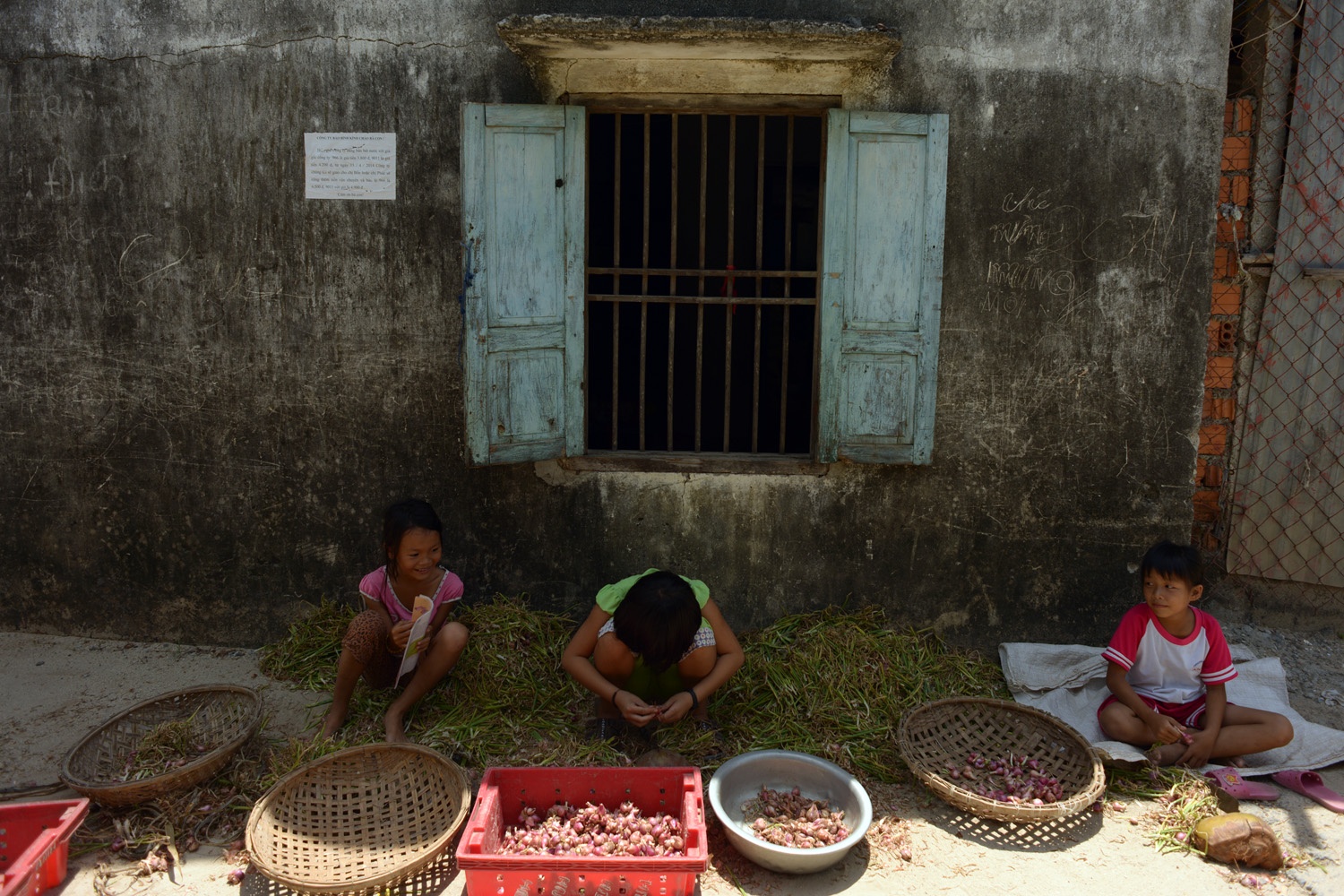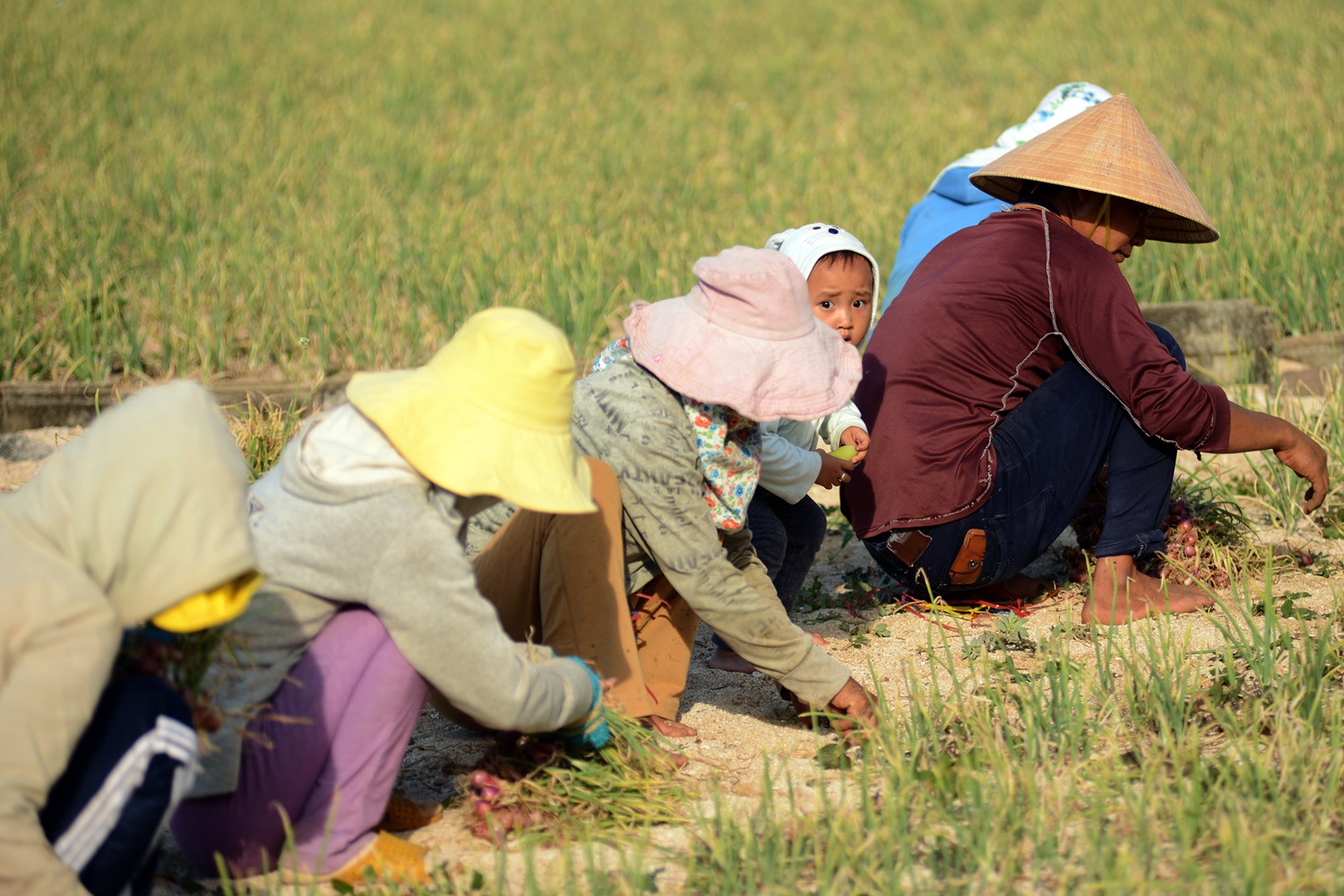 | Cậu bé được cha mẹ đưa đi theo ra cánh đồng trồng hành. Ngoài đánh bắt thuỷ hải sản, thu nhập từ hành tỏi là nguồn quan trọng của người dân ở đây. |