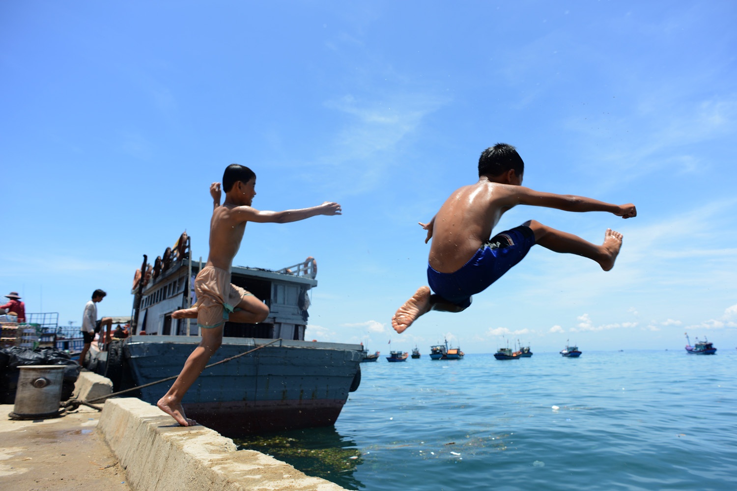 | Trò chơi ưa thích của trẻ em trên đảo Lý Sơn là bắt trước những chú đại bàng biển lao mình từ cầu cảng xuống mặt biển. |