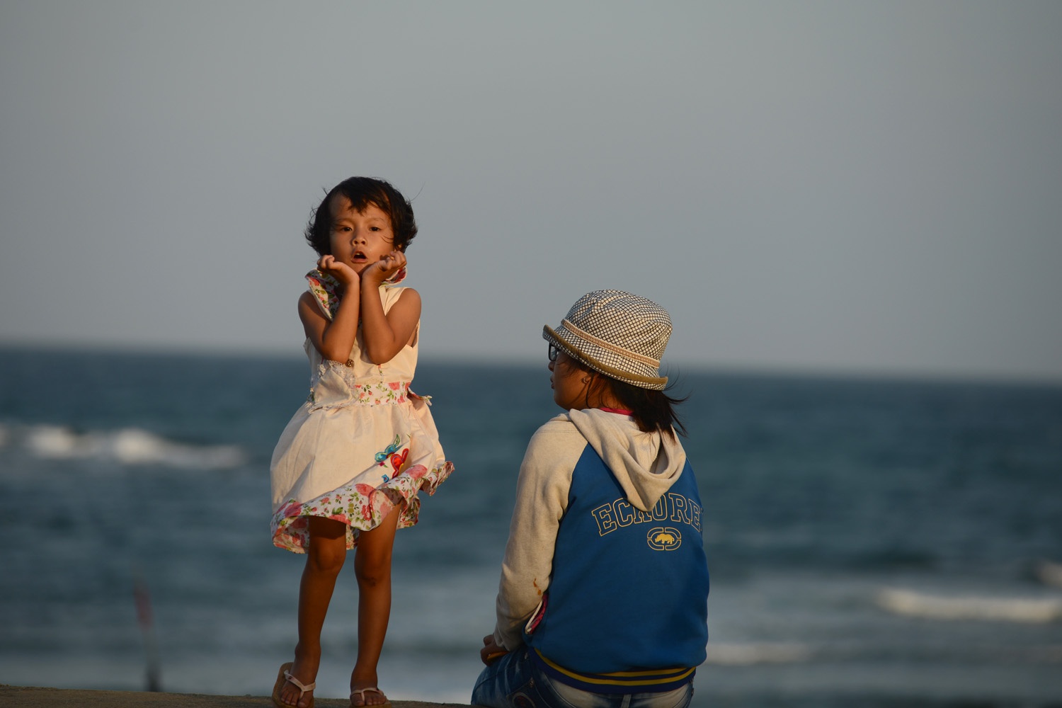 | Cô bé hồn nhiên đứng hát trên bờ kè trong một buổi chiều lộng gió và biển cuộn cuộn sóng. |