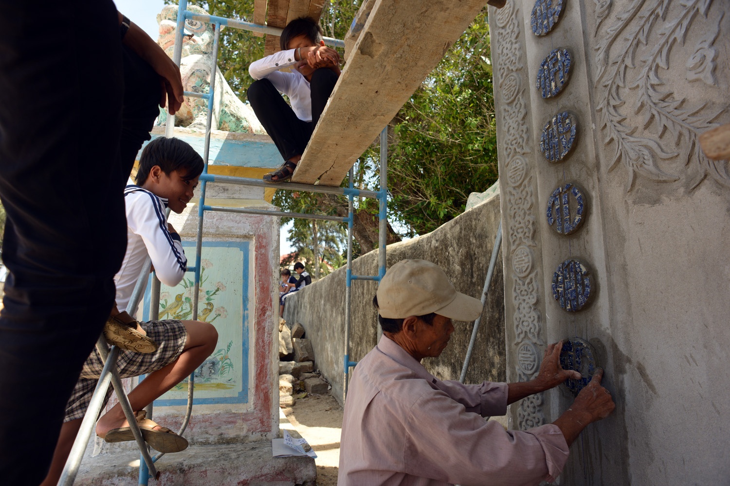 | Những cậu bé say mê nhìn người thợ kép gắn những dòng chữ bằng sứ lên cổng của dinh Tam toà - một di tích lịch sử đặc sắc của đảo Lý Sơn. |