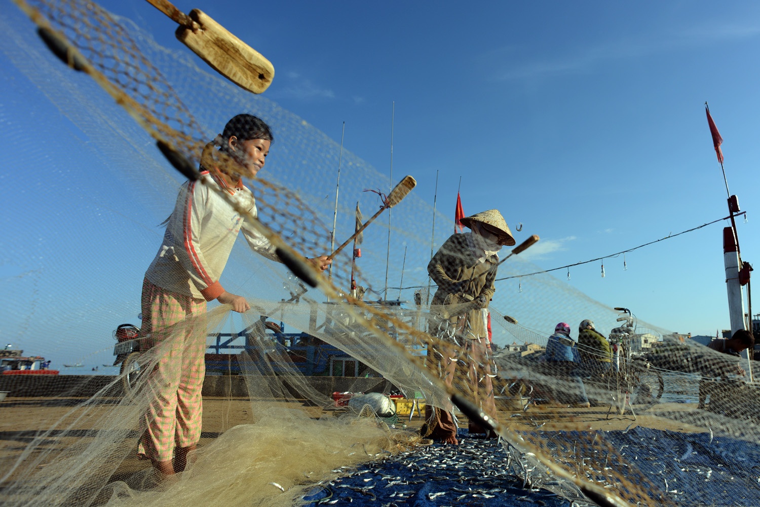 | Cô bé giúp mẹ dỡ lưới gỡ những con cá cơm vừa kéo lên ngay trên cầu tàu Lý Sơn. |