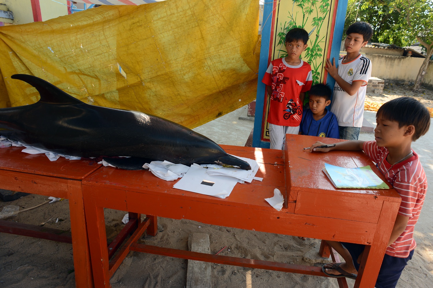 | Những đứa trẻ đứng quan sát một "bà" (cá heo cái) vừa luỵ vào đảo được ngư dân chuẩn bị làm đám tang với những nghi thức truyền thống cổ xưa. |