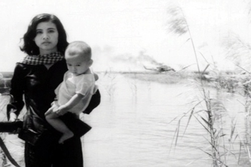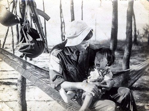 | Sáu Xoa (Thúy An) vừa bồng con vừa đi du kích. |