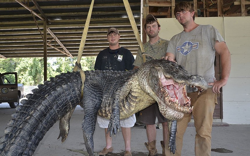 | Dustin Bockman, lái xe 27 tuổi, và đồng đội bắt được con cá sấu nặng 330 kg và dài 3,96 m. Đây là con cá sấu lớn nhất từng được bắt ở sông Mississippi. Ảnh: Reuters |