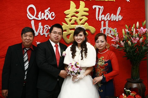 | Đạo diễn Bùi Huy Thuần (ngoài cùng bên trái) đứng cạnh con trai Bùi Quốc Việt trong ngày trọng đại của anh và nữ diễn viên Thanh Hoa. |