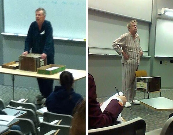| Thầy giáo mặc đồ ngủ đến lớp để phản đối việc kỳ thi tốt nghiệp bắt đầu lúc 7h sáng. |