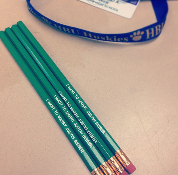 | Giáo viên môn toán quá mệt mỏi với việc học sinh quên trả lại bút chì cho cô. Cô đã in dòng chữ "Tôi muốn cưới Justin Bieber" lên bút. |
