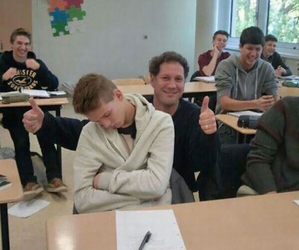 | Thầy tạo dáng khi trò đang ngủ gật. |
