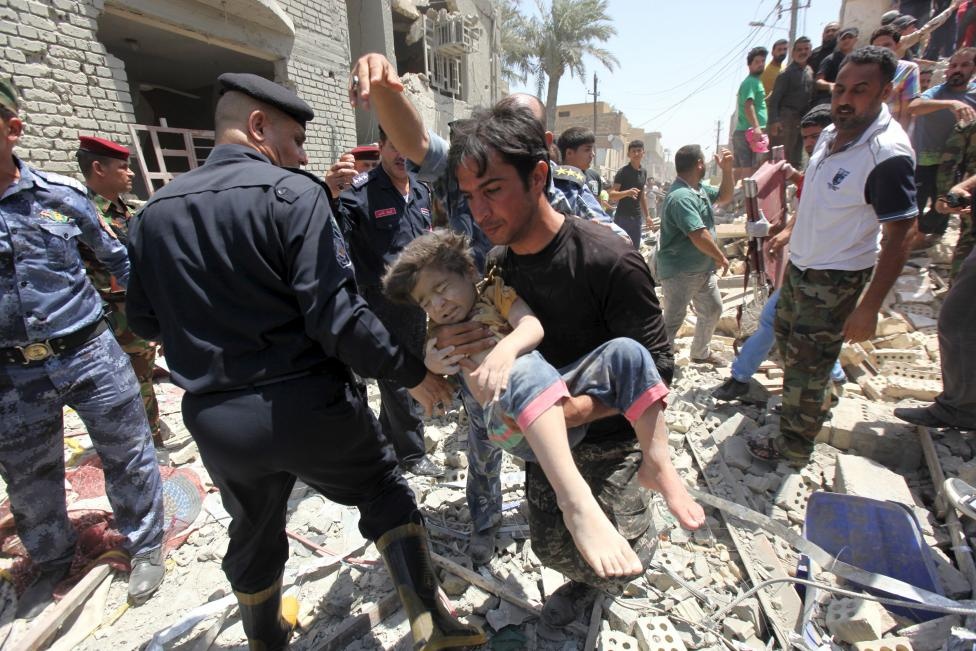 Một người đàn ông bế đứa bé bị thương từ đống đổ nát khi máy bay Sukhoi của quân đội Iraq vô tình thả bom xuống khu dân cư đông đúc ở quận Ni'iriya, thủ đô Baghdad, hôm 6/7. Sự cố khiến ít nhất 5 người thiệt mạng và phá hủy nhiều nhà cửa.