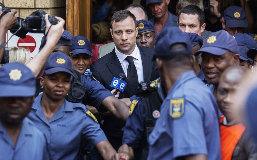 | Vận động viên điền kinh khuyết tật Oscar Pistorius người Nam Phi rời tòa sau khi thoát tội cố sát người yêu. Ảnh: AFP |
