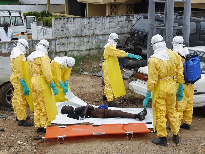 | Nhân viên y tế chuẩn bị chôn cất thi thể một người đàn ông chết vì virus Ebola ở Liberia. Tổ chức Y tế Thế giới (WHO) cảnh báo đại dịch Ebola đang ngày càng diễn biến nguy hiểm ở các nước châu Phi, với số người nhiễm bệnh không ngừng gia tăng. Ảnh: AFP |