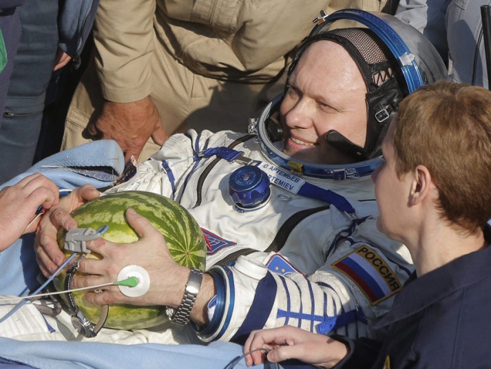 | Phi hành gia người Nga Oleg Artemyev ôm quả dưa hấu sau khi tàu vũ trụ Soyuz TMA-12M đưa anh đáp xuống một khu đất trống ở Zhezkazgan, Kazakhstan. Artemyev làm việc liên tục trên Trạm vũ trụ Quốc tế (ISS) suốt 6 tháng trước khi trở về trái đất. Ảnh: EPA |